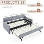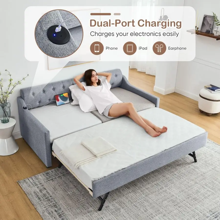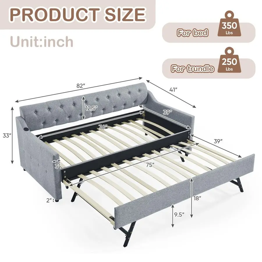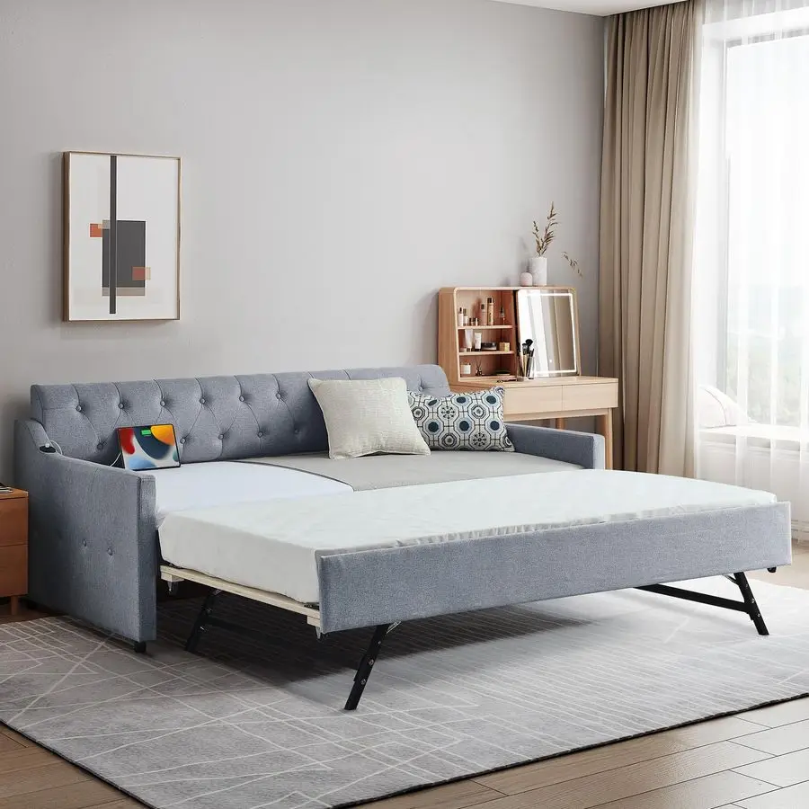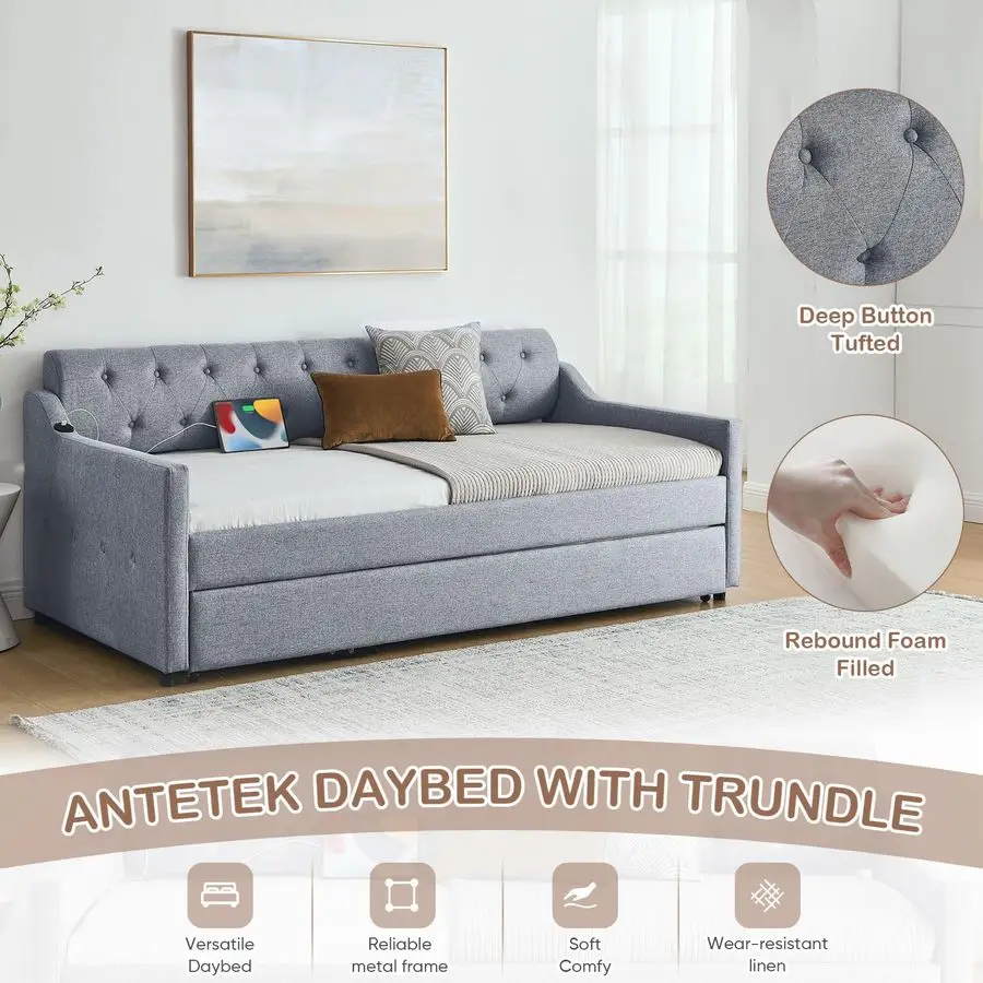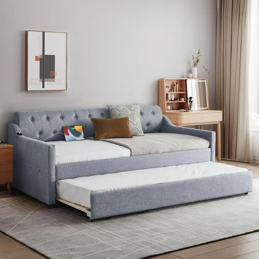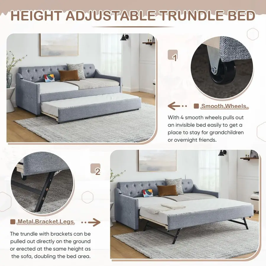 Modern Linen Daybed Our daybed with a pop up trundle features hardwearing linen fabric. The semicircular backrest is designed with deep buttons tufted and is matched with diamondshaped wiring to create an elegant style. Highquality upholstery with a thick padded sponge on the back and all around for fabulous comfort. With its simple design and stylish appearance, which are suitable for any home decoration